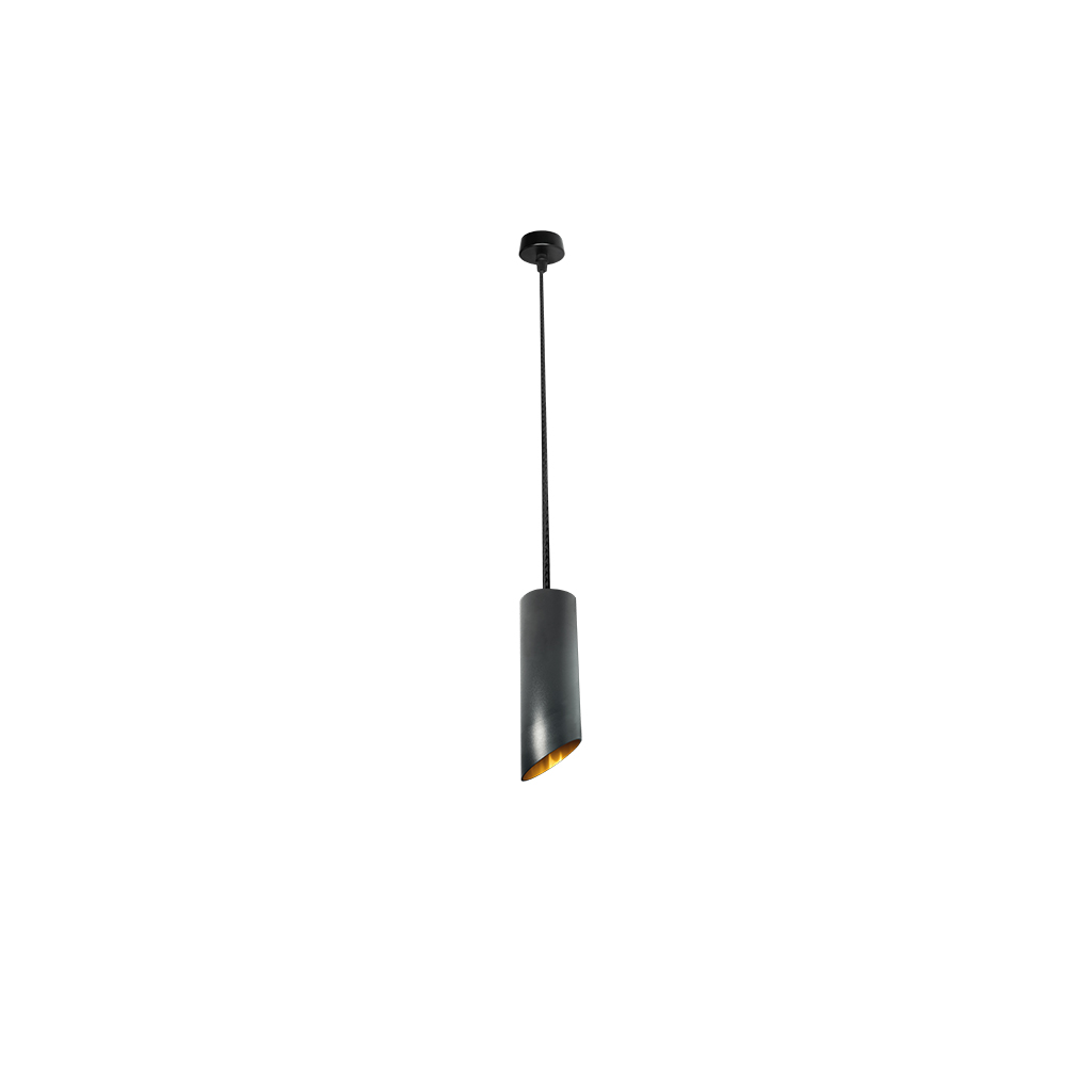 Luminario tubular de suspender para lámpara tipo dicroica GU10, máx 50 Watts, óptica 120°, 6 cm diam * 23 cm alto, 1 m cable, aluminio acabado negro/dorado, protección IP20